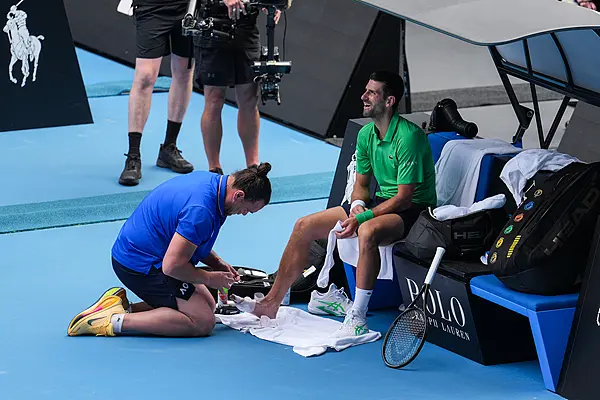 在大比分0比2落后的不利局面下,德约科维奇因右脚水泡申请医疗暂停,医护人员为他的右脚进行了厚厚的包扎。治疗期间,德约面露痛苦,状态看似堪忧。第三盘开始后,德约科维奇也在每一分的间隙,花费大量时间拉伸身体各个部位。